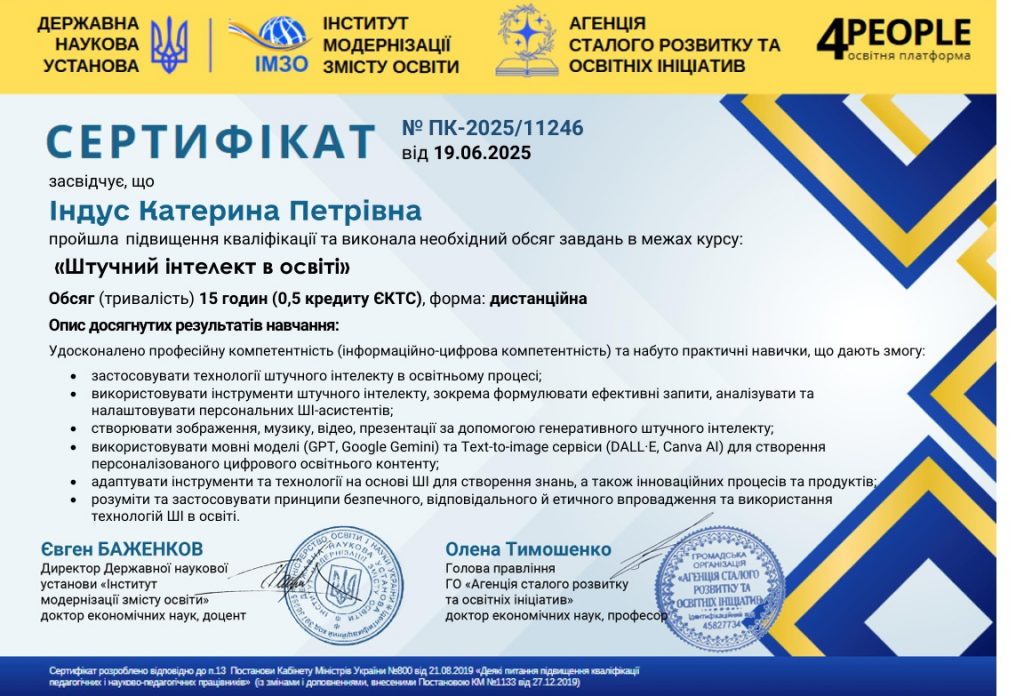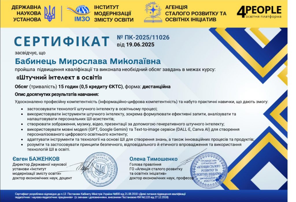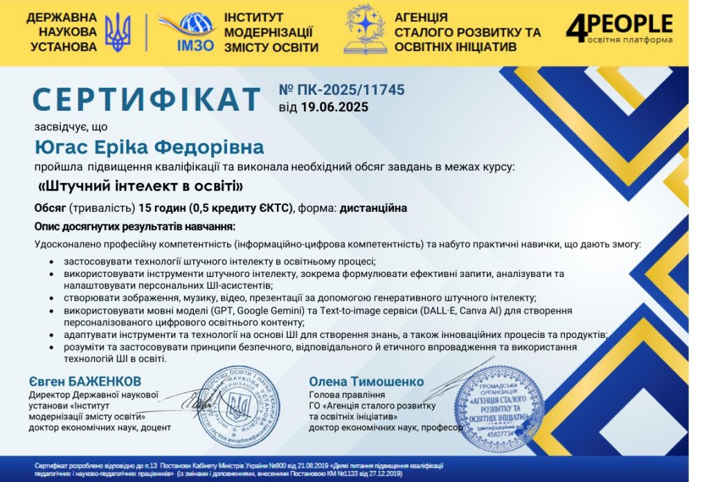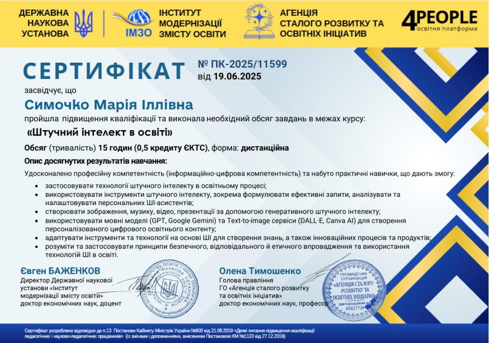 • практичне опанування сучасних інструментів штучного інтелекту: ChatGPT, Copilot, Eduaide, Diffit, Curipod, MagicSchool.ai та ін.