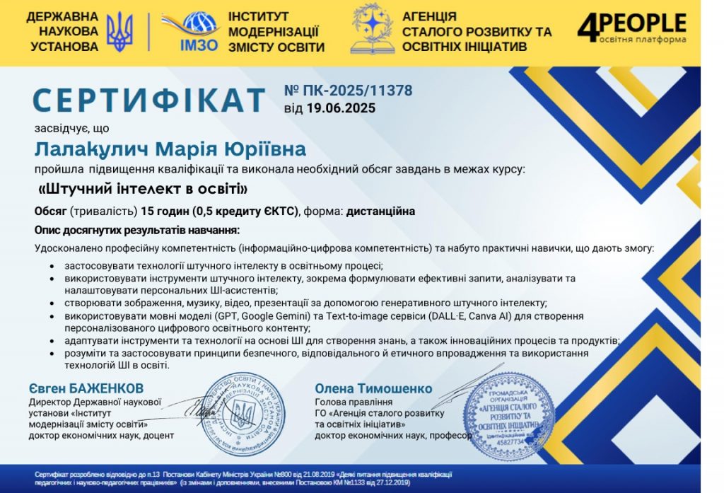 Участь у Всеукраїнському практичному онлайн-курсі «ШТУЧНИЙ ІНТЕЛЕКТ В ОСВІТІ»