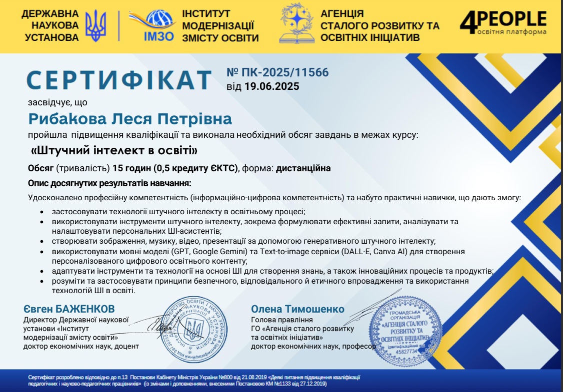 • практичне опанування сучасних інструментів штучного інтелекту: ChatGPT, Copilot, Eduaide, Diffit, Curipod, MagicSchool.ai та ін.