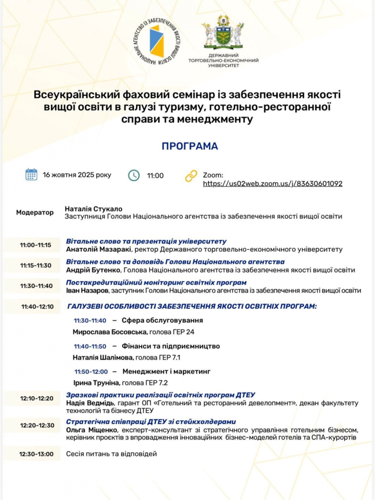 16 жовтня 2025 року науково педагогічні працівники кафедри технології і організації ресторанного господарства прийняли участь у Всеукраїнському фаховому семінарі із забезпечення якості вищої освіти в галузі туризму, готельно-ресторанної справи та менеджменту у партнерстві з Державним торговельно-економічним університетом (ДТЕУ), який провело Національне агентство із забезпечення якості вищої освіти.
