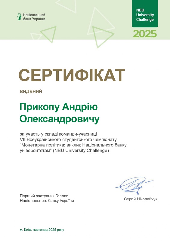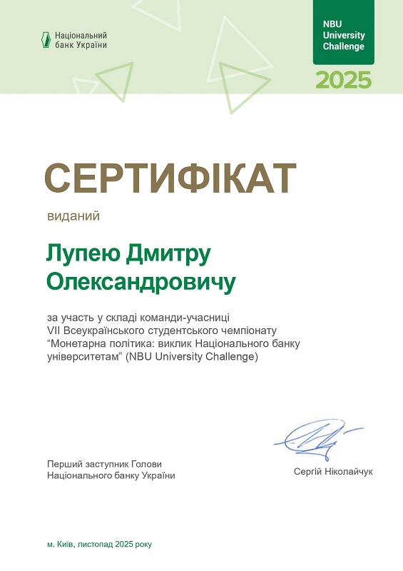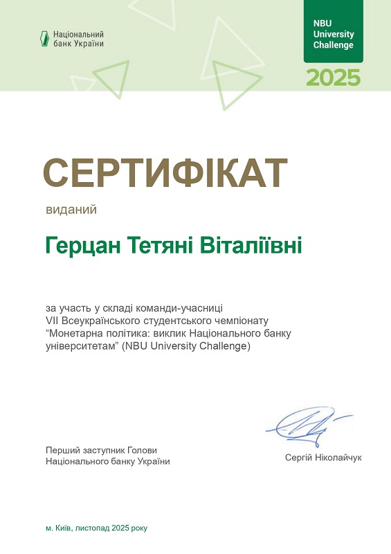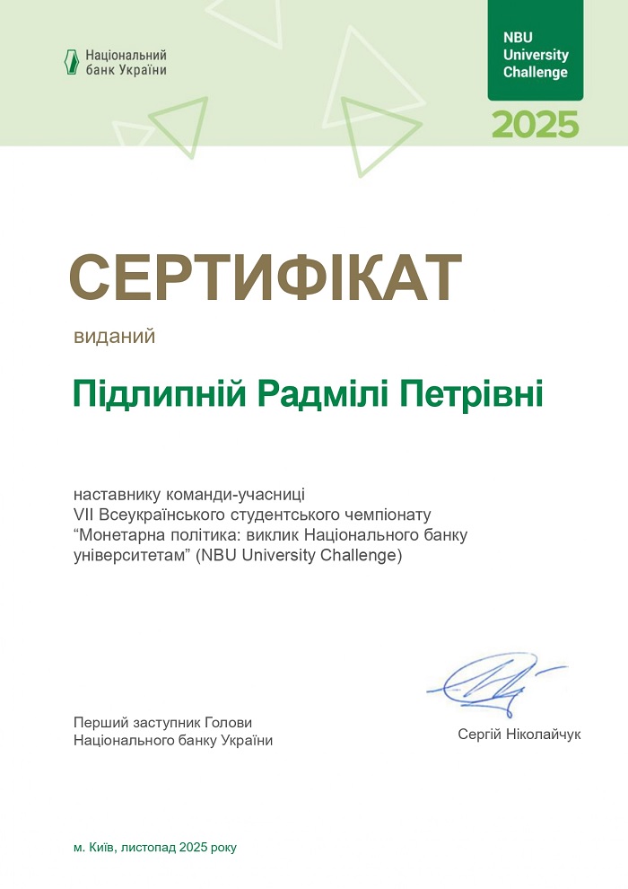 У період з 12 вересня по 20 листопада 2025 року здобувачі спеціальності 072 «Фінанси, банківська справа, страхування та фондовий ринок» під керівництвом д.е.н., професора, завідувача кафедри фінансів, обліку та оподаткування Радміли ПІДЛИПНОЇ взяли участь у всеукраїнських змаганнях NBU University Challenge «Монетарна політика: виклик НБУ університетам», організованих Національним банком України.